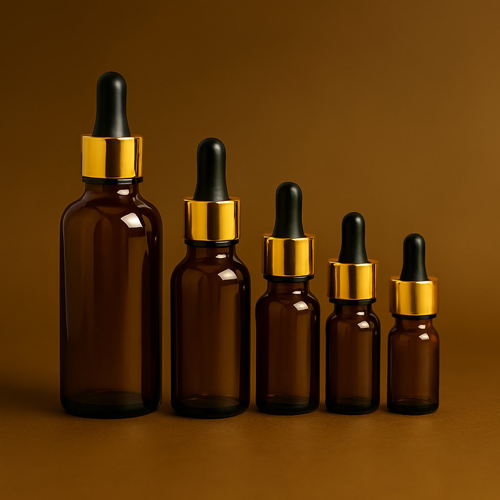 Elegant amber glass serum bottles with golden black caps, available in 15ml, 20ml, 30ml, 50ml & 100ml sizes. Perfect for serums, essential oils, facial care, and luxury cosmetic packaging.