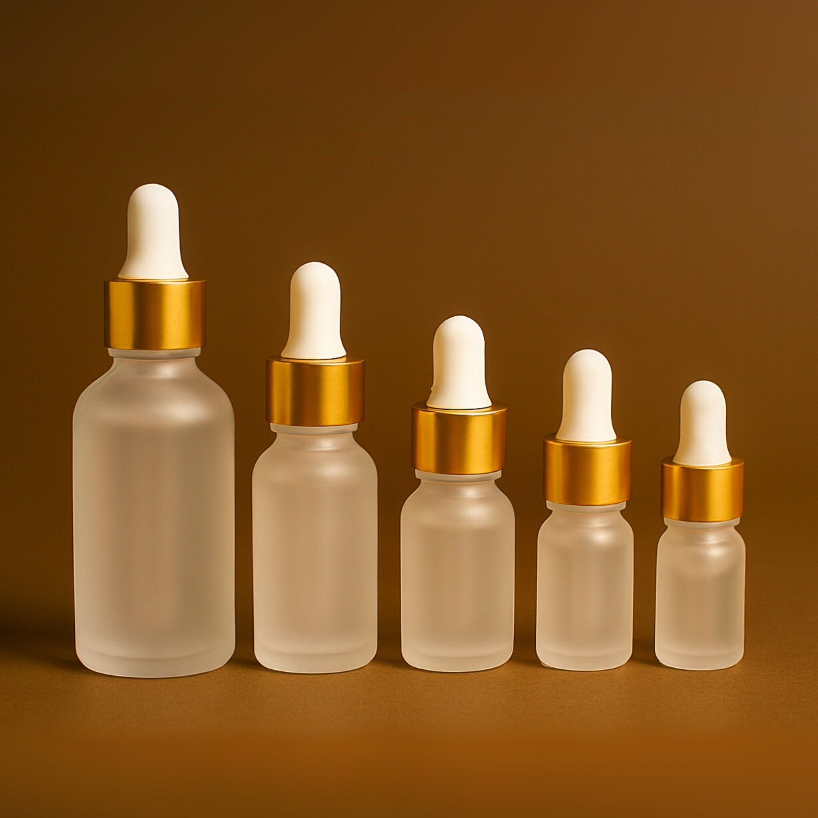 Stylish frosted glass serum bottles with golden white caps, available in 10ml, 15ml, 20ml, 30ml & 50ml. Perfect for serums, essential oils, facial care, and luxury cosmetic packaging.
